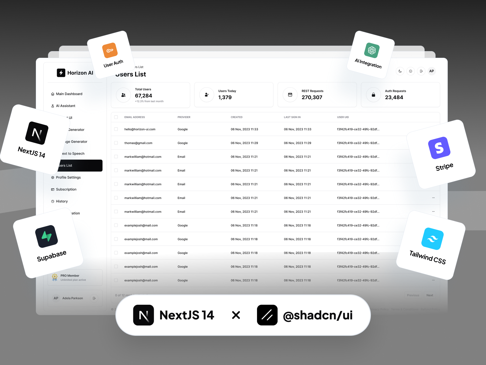 Horizon AI Boilerplate PRO - NextJS is built with over 100+ frontend individual elements & pages, like GPT AI Chat, Text to Speech API, Profile settings, OpenAI Assistant, buttons, inputs, navbars, nav tabs, cards, alerts, and so on, giving you the freedom of choosing and combining. All components can take variations in color, which you can easily modify using classes. You will save a lot of time going from prototyping to full-functional code because all elements are implemented. This Premium @shadcn/ui Kit is coming with prebuilt design blocks, so the development process is seamless, switching from our pages to the real website is very easy to be done.