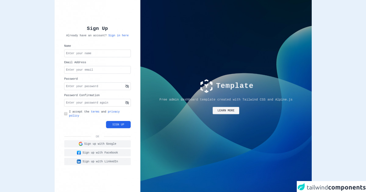 Tailwind CSS & Alpine.js Sign up full page